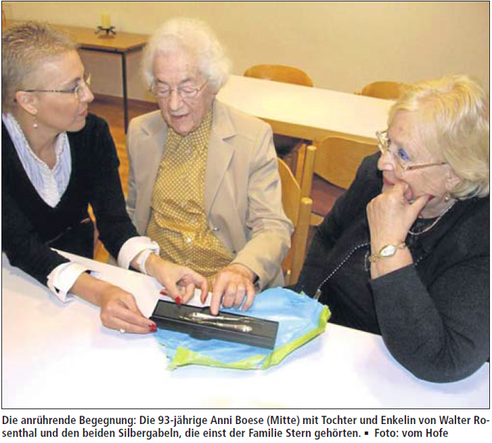 Ganz bewusst abseits von dem Trubel in dem mit über 100 Menschen gefüllten Gemeindesaal gab es in einem kleinen Nebenraum eine Begegnung, wie sie dem Drehbuch eines aufwühlenden Dokudramas hätte entsprungen sein können. Die 93-jährige Meinerzhagenerin Anni Boese, Tochter des stadtbekannten Bäckers Julius Kamphaus, vollzog im einstigen Haus ihrer Eltern den letzten Akt eines ganz besonderen Vermächtnisses. „Eine Herzensangelegenheit in einer Geschichte, die mich bis heute nicht los gelassen hat“, wie sie dem Chronisten der MZ erzählte, der die besondere Freude hatte, an dieser schicksalhaften Begegnung teilnehmen zu dürfen. Anni Boese übergab an die Tochter und Enkeltochter von Walter Rosenthal je eine silberne Gabel, die sie in einem dazugehörigen Etui über mehr als siebzig Jahre lang sorgsam aufbewahrt hatte. Es war die letzte Erinnerung an die einstige Nachbarsfamilie Stern. Emil Stern hatte vor seiner Deportierung im April 1942 einige Dinge in die Obhut von Familie Kamphaus gegeben, die man auf die Reise, die ins Vernichtungslager führen sollte, nicht mitnehmen durfte. „Eine Tischdecke, Römer-Gläser, einige Kleidungsstücke und auch zwei Silbergabeln als einzige Überbleibsel aus dem wertvollen Familienbesteck“, zählt Anni Boese auf. Sie hat nach dem Krieg und zuletzt 1982, als es auf Einladung des Arbeitskreises Juden und Christen und der Stadt Meinerzhagen zum ersten offiziellen Besuch von Überlebenden des Holocaust in deren einstiger Heimatstadt kam, nach und nach diese Erinnerungsstücke aus dem Besitz der Familie Stern als Geschenke an deren überlebende jüdischen Angehörigen, Freunde und Bekannte abgegeben. Ein solches Erinnerungsstück bekam 1982 auch Walter Rosenthal, der es mit nach Israel nahm.